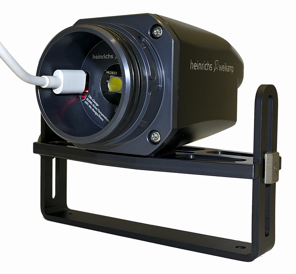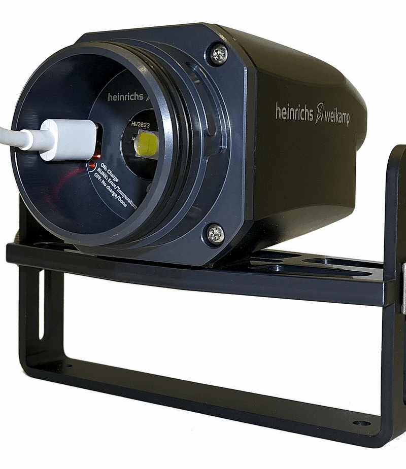 Die hw40 ist die erste Hauptlampe für technische Taucher, die sich über USB-C PD laden lässt. Netzteile mit 45W und mehr sind mittlerweile ein preiswertes Massenprodukt und der bewusste Verzicht auf ein dezidiertes Ladegerät hat für den Anwender nur Vorteile. Die hw40 kann dabei mit USB-C PD Netzteilen der 45W (Oder mehr) oder 25W-Klasse betrieben werden. Das Laden mit einfachen 10W Netzteilen (5V/2A) ist auch möglich, wird aber wegen der langen Ladedauer von ca. 12h nicht empfohlen. Der Lade-Anschluss ist eine USB-C Buchse, welche nur als Senke ausgelegt ist. Die hw40 ist keine Powerbank zum Laden anderer Geräte. Mit 45W ist die hw40 in etwa 2h vollständig geladen, bei einem 25W Netzteil in etwa 4h. Ladedauer und Leistung sind temperaturabhängig. Es empfiehlt sich ein Laden bei Raumtemperatur (20°C), die hw40 sollte nicht bei Temperaturen >35°C geladen werden und bricht den Ladevorgang sonst ab. Eine grüne LED zeigt den verwendeten Lademodus an. Die rote LED leuchtet während der Ladung, blinkt bei etwaigen Fehlern und erlischt, sobald der Akku vollständig geladen wurde. Eine Kurzanleitung dieser LED-Signale ist auf dem Aluminium-Teil aufgedruckt.
